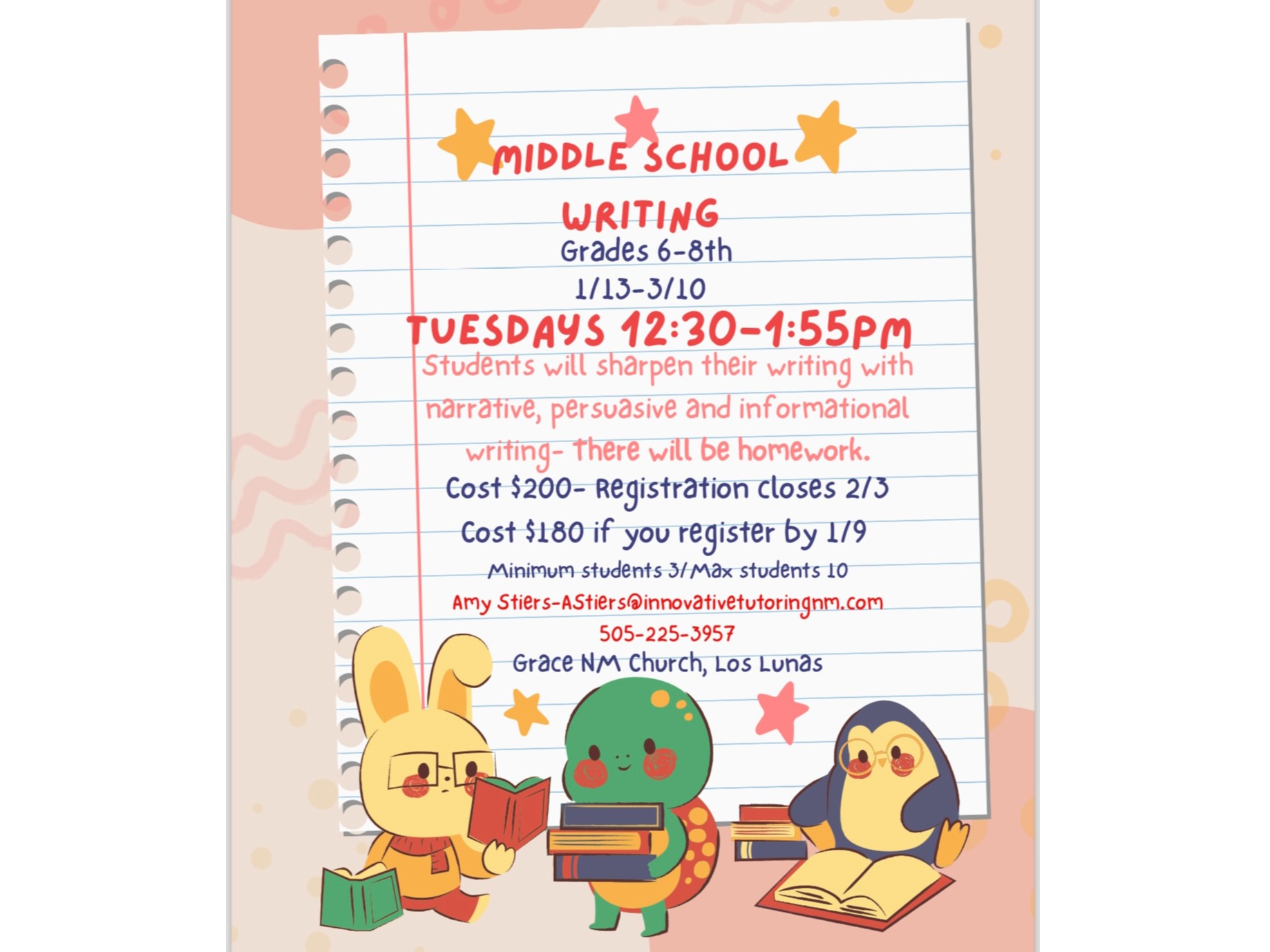 Lessons will include learning about and writing poetry, narrative or story writing, persuasive or argumentative writing and a personal memoir. Students will have about 1 hour of homework a week to complete their writing assignments. Feedback on writing will be given.